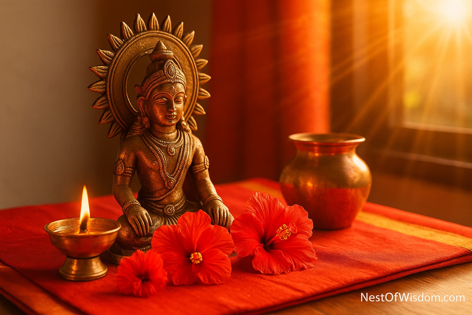 Red, orange, or clean white symbolize Surya’s energy—choose what feels devotional and simple.